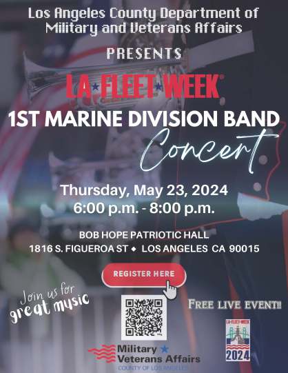 Come check out the 1st Marine Division Band at Bob Hope Patriotic Hall this evening from 6:00 – 8:00 PM.