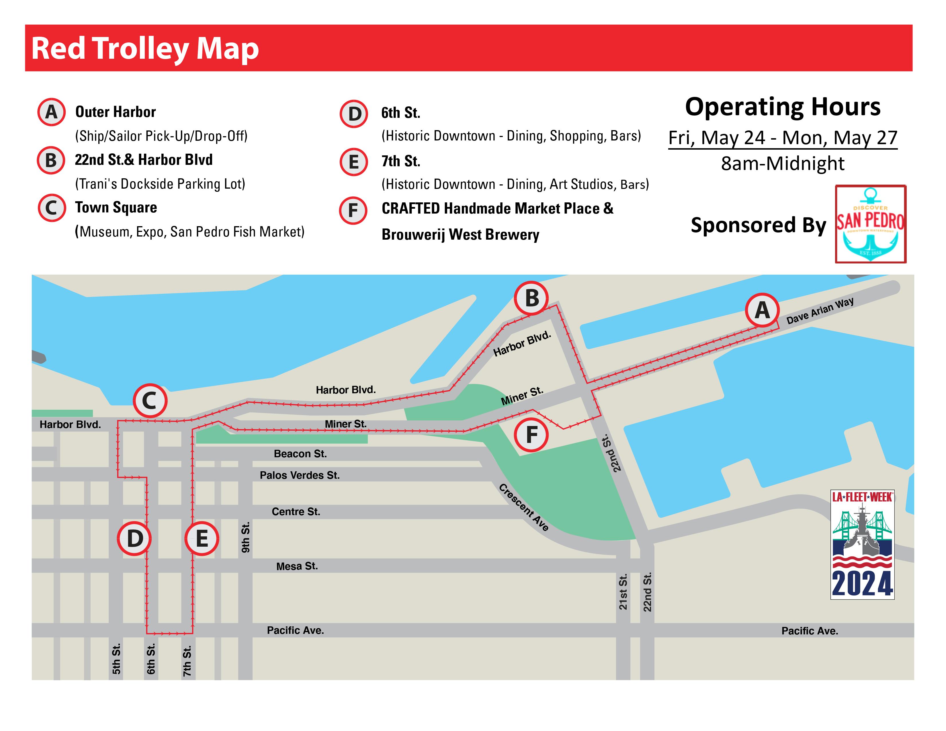 - Parking at Remote Lot: FREE with shuttle service to and from the LA Fleet Week event site. This remote lot is located on 22nd Street between Samson Way and Miner Street. Please refer to our 2024 Red Trolley and Shuttle Map. This map shows both trolley routes and parking locations