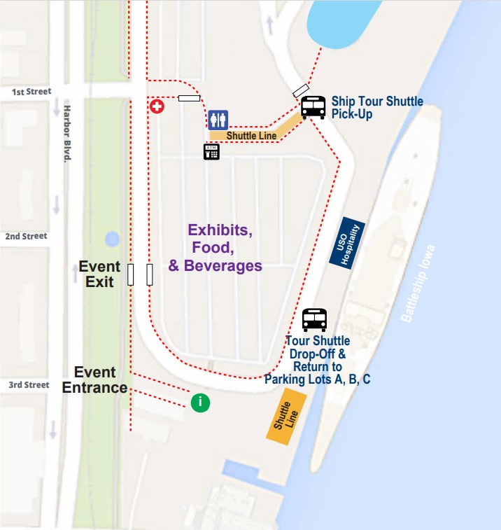 Select Port of Los Angeles Administration Building (425 S. Palos Verdes St., San Pedro) as your drop off destination. Walk down 5th Street to the EXPO in front of Battleship IOWA.