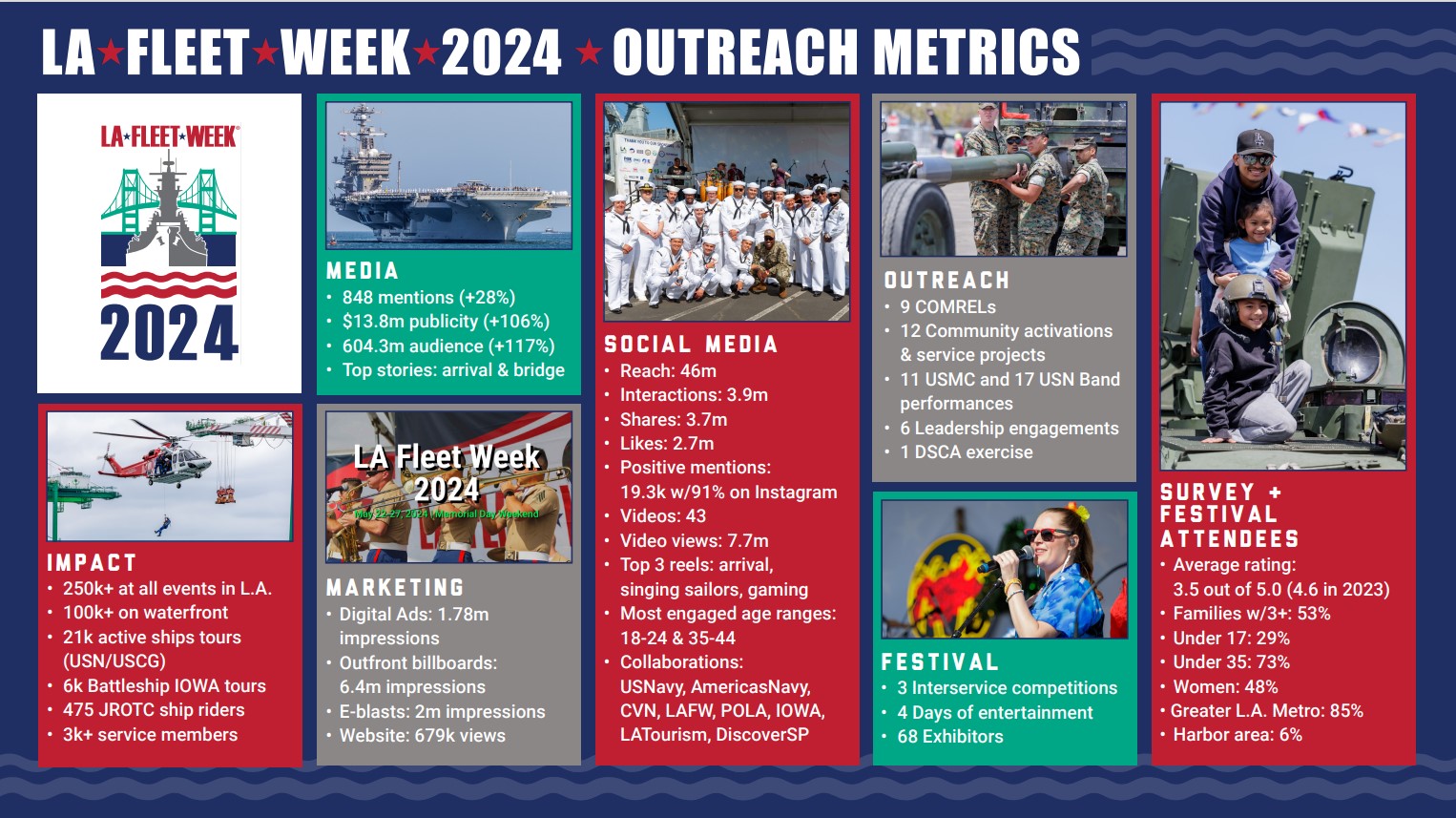 Sponsoring LA Fleet Week is a dynamic experience that helps your organization achieve your annual goals and objectives. The audience is diverse and includes veterans, public, and military service members. Your sponsorship makes it possible for the event to occur and be open at no-cost to the public. Review our sponsorship today and reach out to see how we can help you reach your goal in gaining exposure to thousands of attendees and millions of impressions.